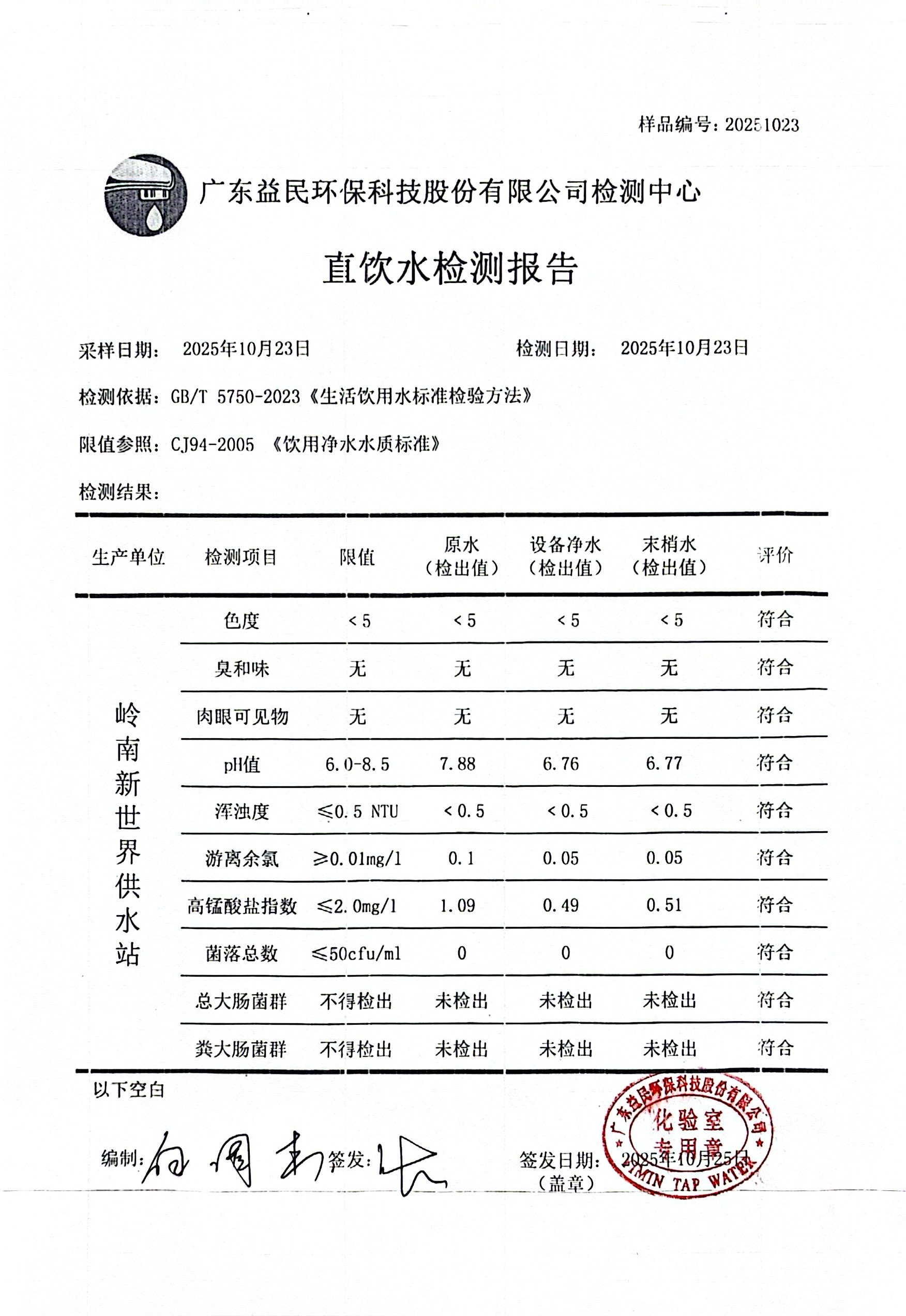 岭南新世界2025年10月23日水质检测报告公示
