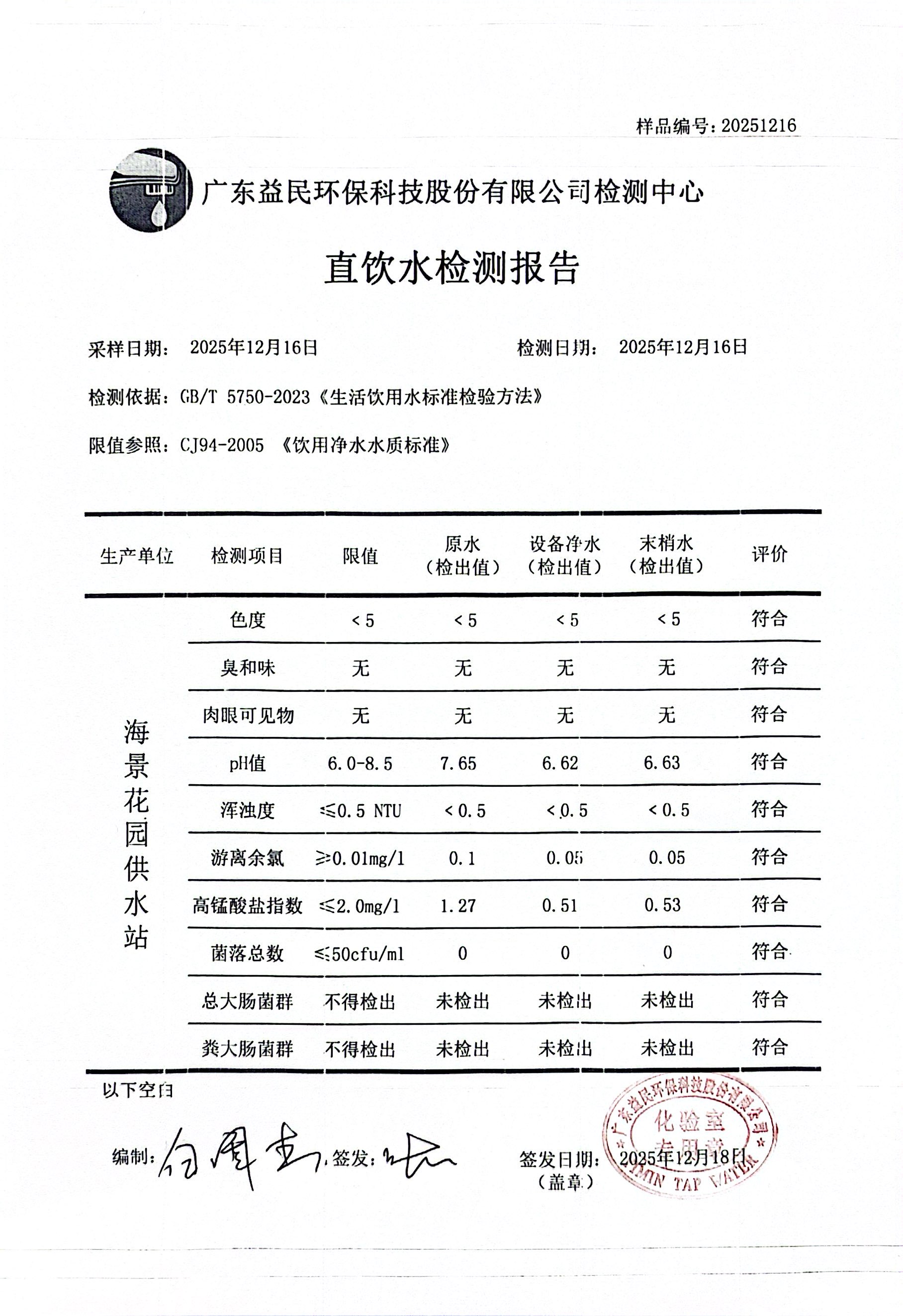 海景花园2025年12月16日水质检测报告公示