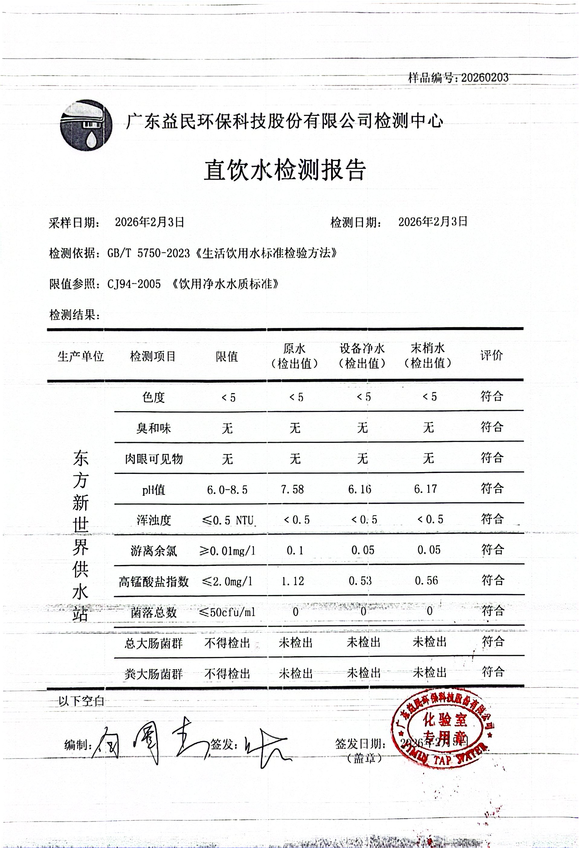 东方新世界2026年02月03日水质检测报告公示