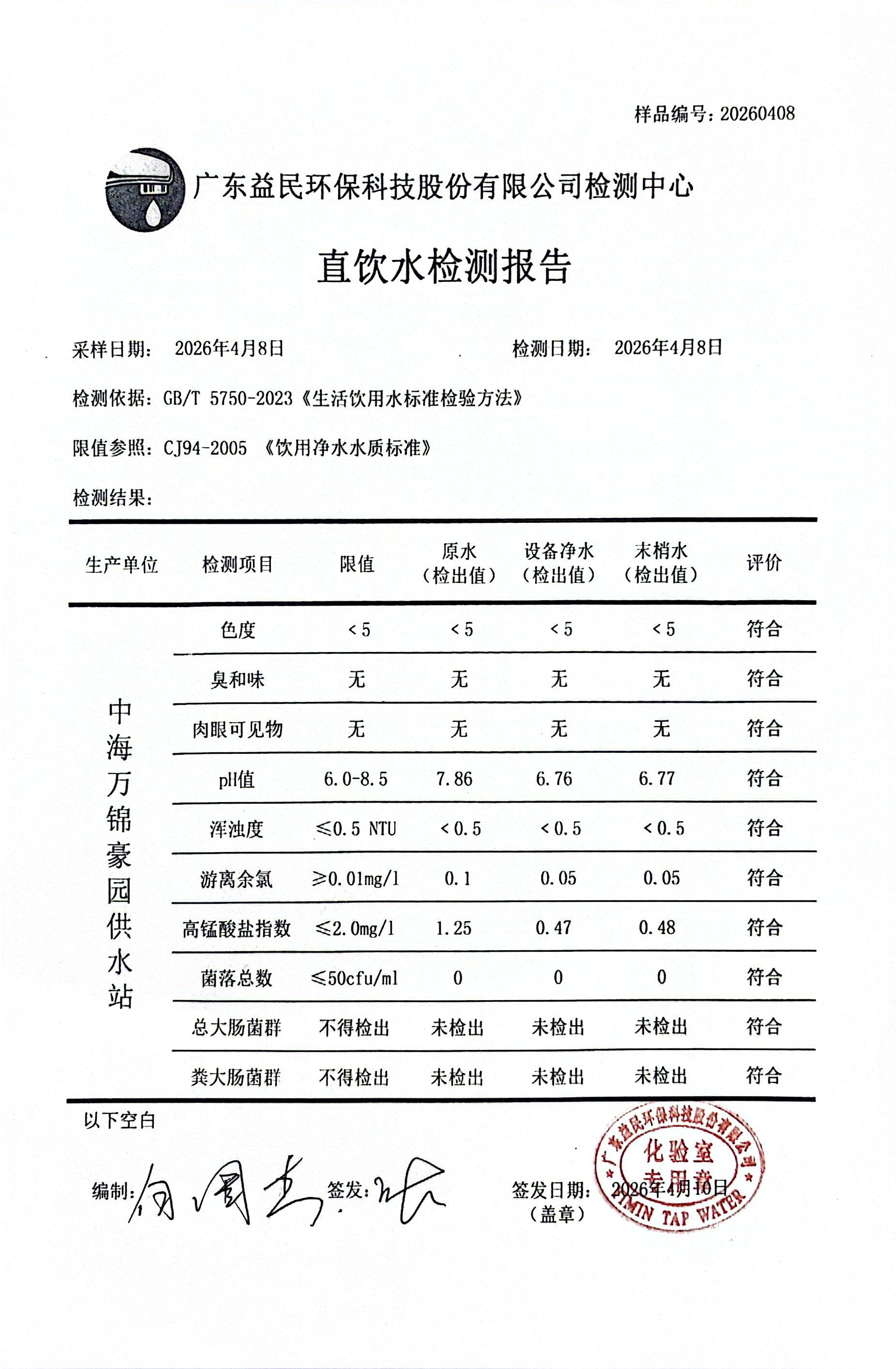 中海万锦豪园2026年04月08日水质检测报告公示