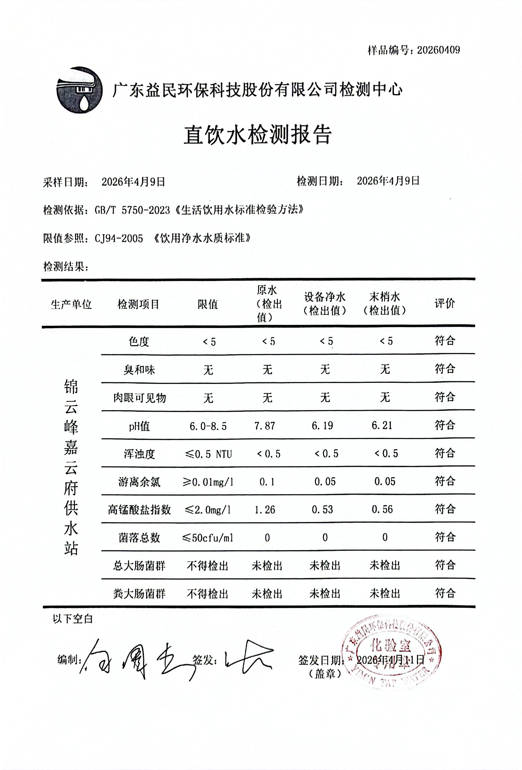 锦云峰嘉云府2026年04月09日水质检测报告公示