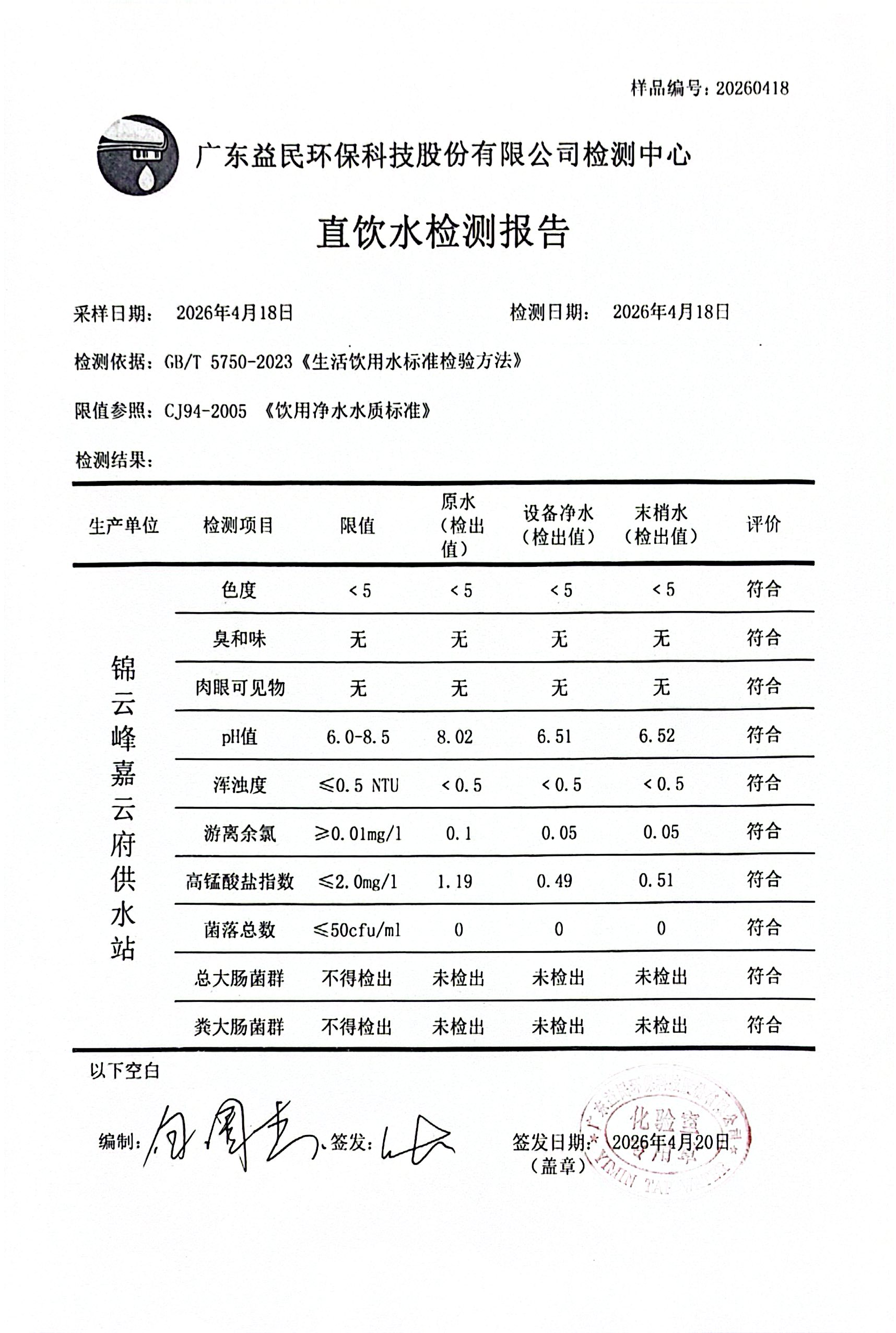 锦云峰嘉云府2026年04月18日水质检测报告公示