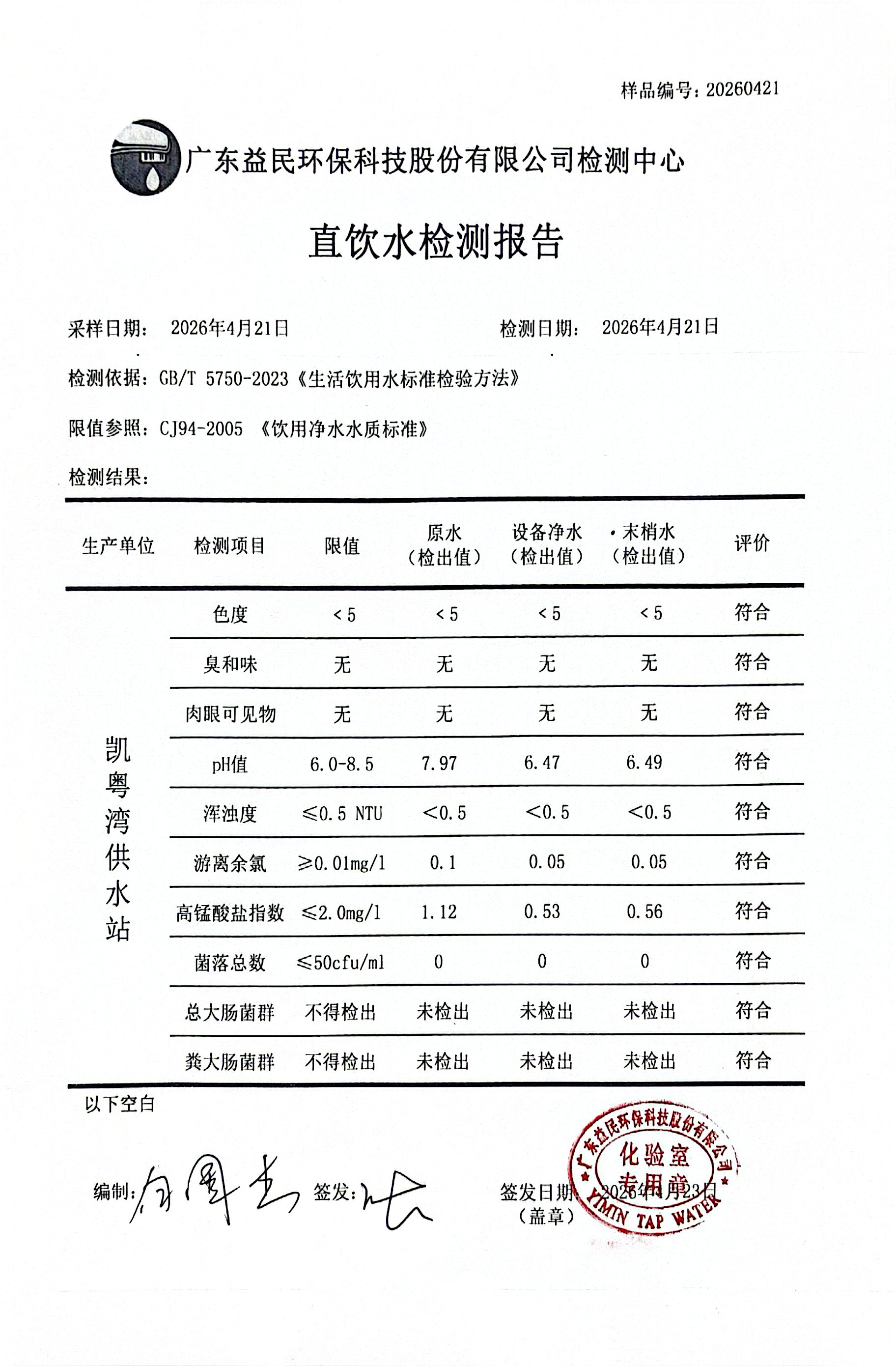 凯粤湾2026年04月21日水质检测报告公示