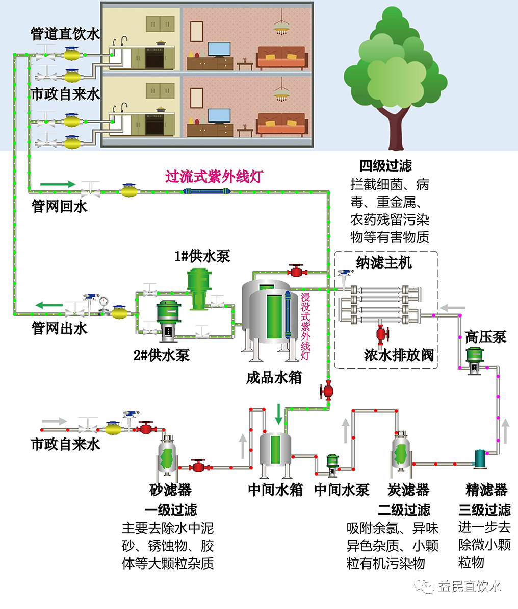 二是直饮水管网为全密封性体系,且供水系统采用变频供水方式,不需要储水池,不存在二次污染的源头;