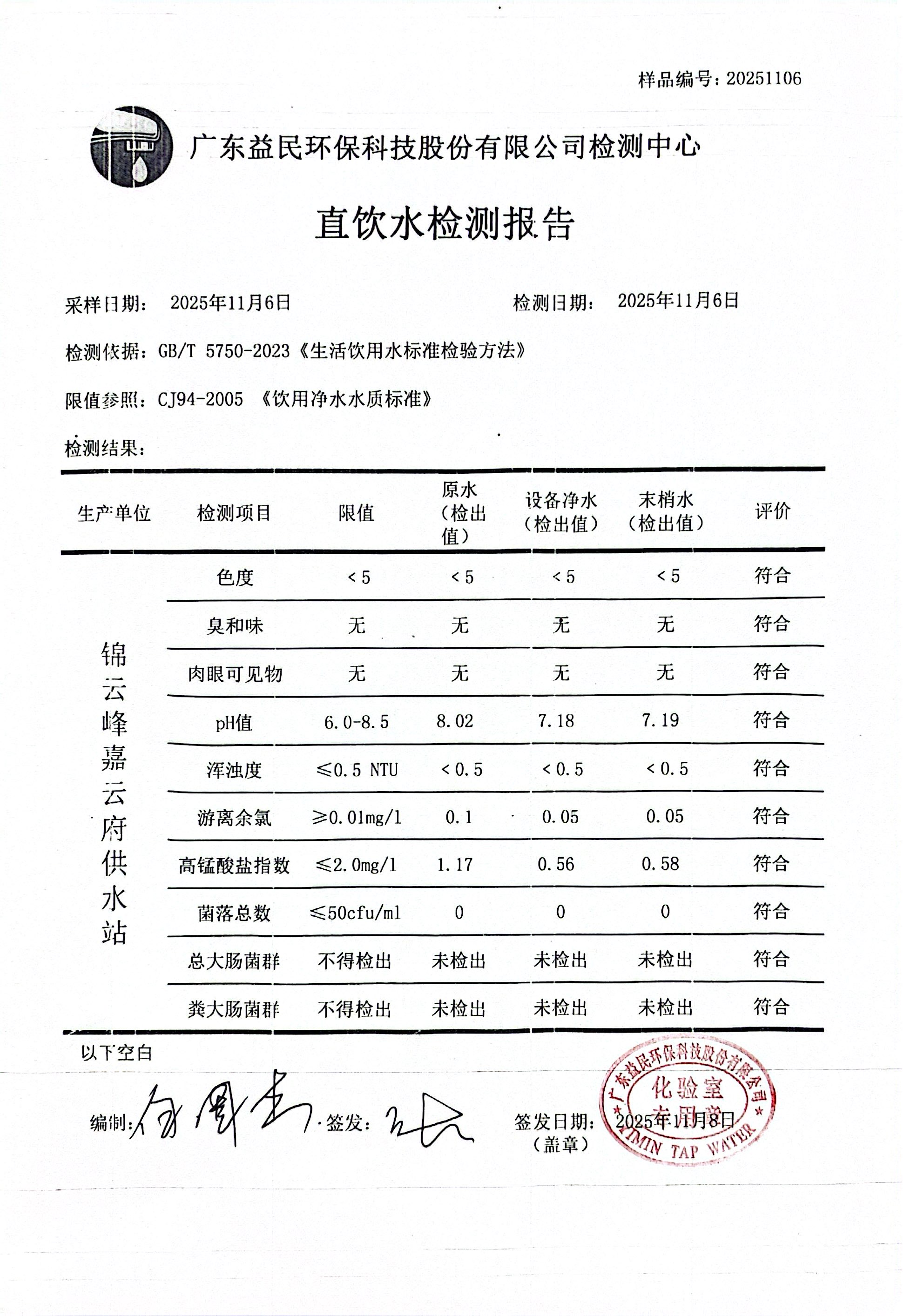 锦云峰嘉云府2025年11月06日水质检测报告公示