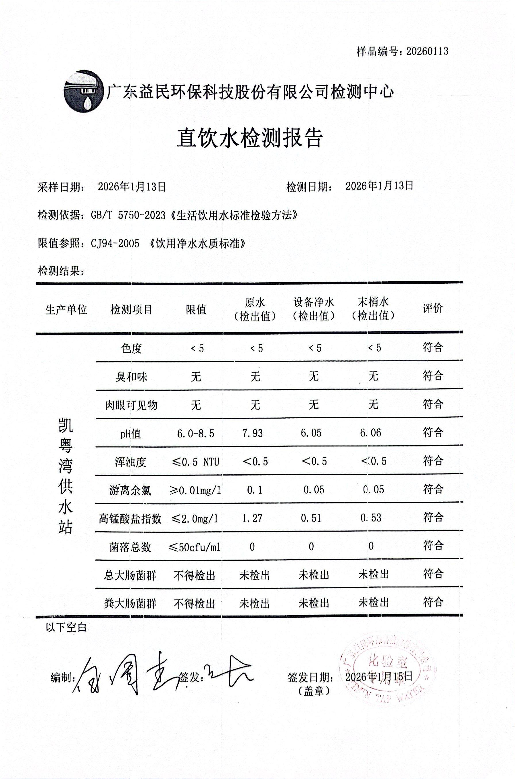 凯粤湾2026年01月13日水质检测报告公示