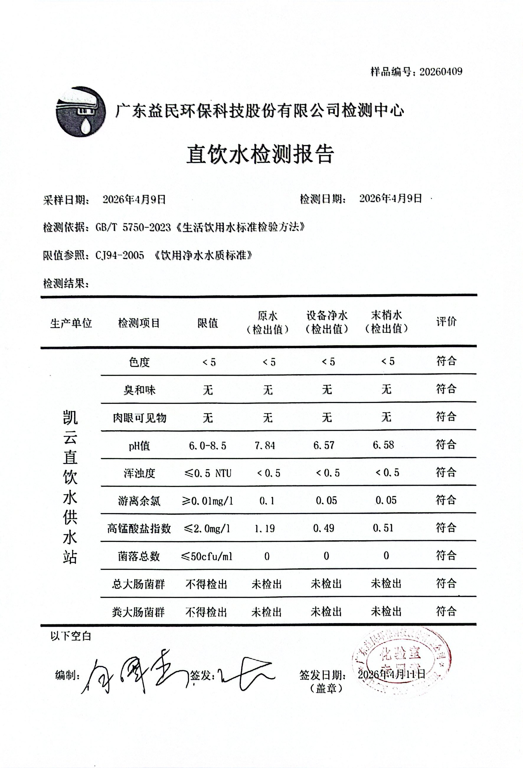 凯云新世界2026年04月09日水质检测报告公示
